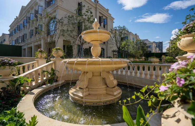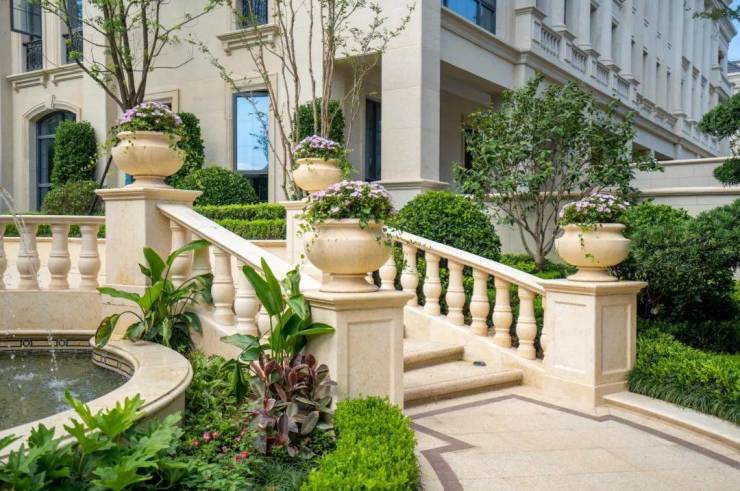 整个园区,以经典的绿城法式墅区景观大中轴贯穿,占地约1000多㎡,联排建筑的设计,融合了中国传统院落布局与法国枫丹白露宫的审美,外立面大面积采用全石材干挂,檐口等细节部位使用仿石。
