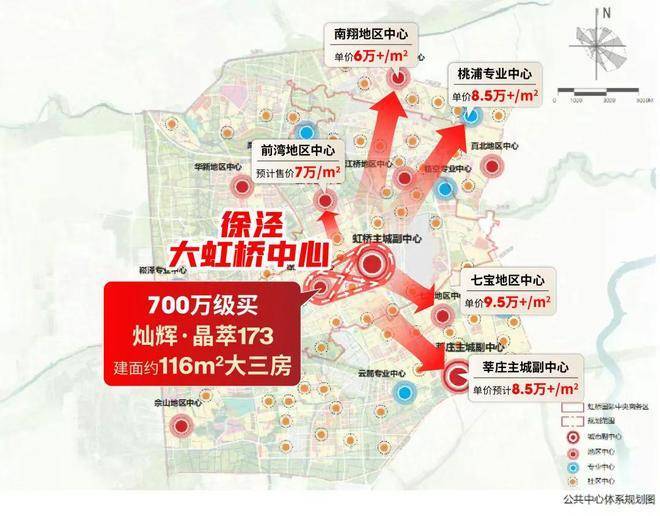 据销售人员透露,灿辉·晶萃173的总价在700-1000万左右,116㎡改善大三房总价700万级。而同样700万,只能买七宝、莘庄、桃浦等板块的90㎡紧凑户型,或者买南翔、华漕的100㎡户型。这些板块比起徐泾如何?