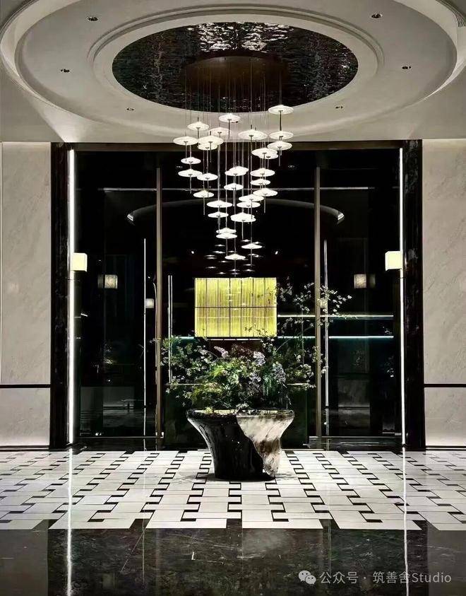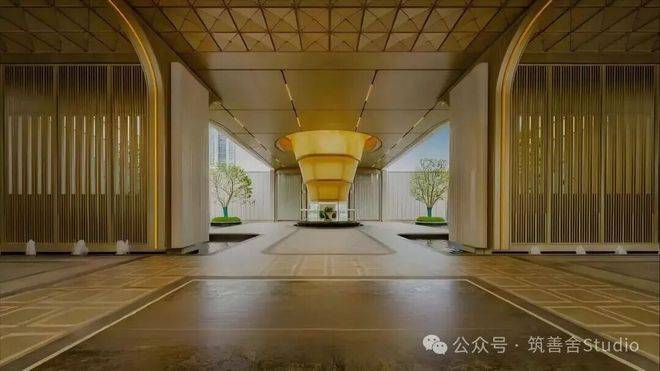 48米环岛门庭,尊享身份的尊崇礼遇。灵感源自国际奢华酒店,整体以“玉树穹顶”为设计理念,约5.5米鎏金玉柱托起恢宏天幕,光影流淌如御玺加身,尽显非凡气度。滨屿水庭静泊四棵名贵铁冬青,华灯穹宇渲染空间的高雅基调,每一步向前,皆是从喧嚣都市步入静谧私域的尊贵仪典。