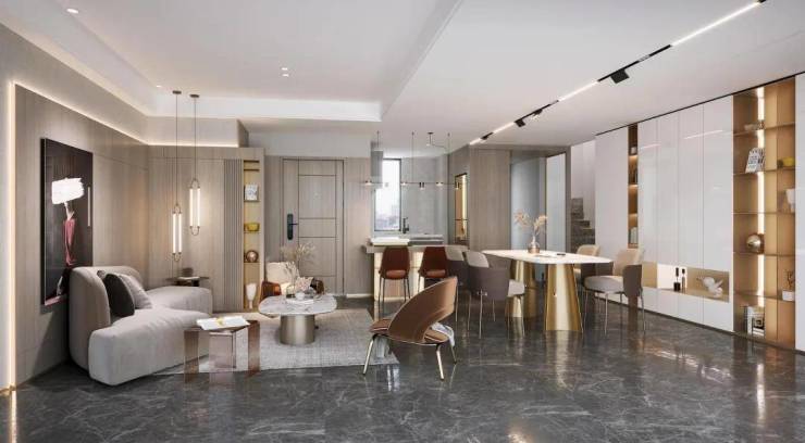 独立的入户玄关,出入皆有生活的仪式感,更方便做细致的收纳分区;客厅、餐厅相互独立,客厅南连宽景阳台,餐厅北连飘窗,让空间得以延展的同时,也让阳台的功能多样化;厨房就近连接餐厅,动线清晰,客餐厅通透明亮。