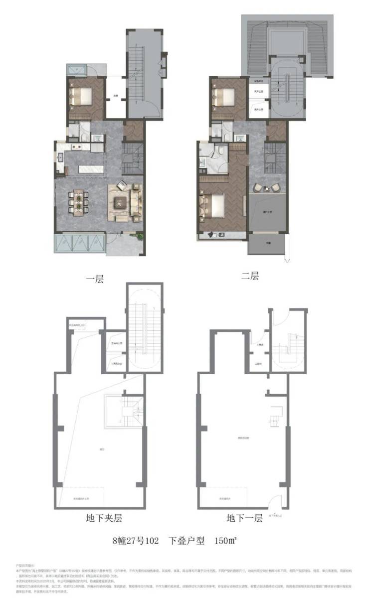 建面约150㎡下叠,一楼餐客横厅连通独立前庭,局部挑高设计,铺陈生活的礼序;二楼独立套房设计,三大卧室空间,三代同堂也能互不干扰。地下室约5.65米挑高,收藏时光馈赠的美好记忆。
