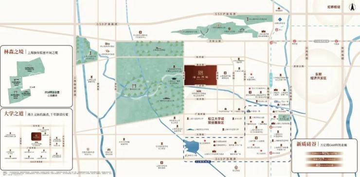 地块所在的广富林板块,本身的生态资源非常优秀!项目西侧一路之隔就是广富林文化遗址、广富林郊野公园、直线距离约1km+是辰山植物园,北面直线距离约3km是佘山国家森林公园、月湖雕塑公园等。