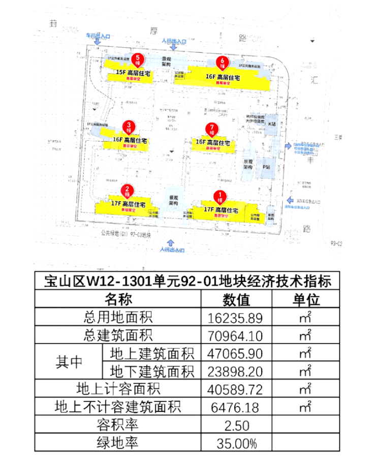 宝山区南大地块分为5个住宅地块(容积率为2.5-2.6)和1个办公和商业地块(容积率为7.2),建设用地总面积约9.9万㎡,规划总建筑面积约32.2万㎡。