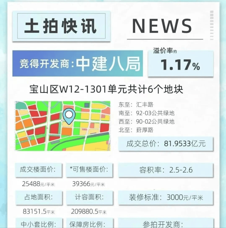 6月19日,上海五批次土拍中,中建八局以总价819533万元,夺得宝山南大“巨无霸”地块——宝山区W12-1301单元90-01、91-01、92-01、93-01、94-01、87-01地块。该地块成交楼板价25487元/㎡,溢价率1.17%,装修标准≥3000元/㎡。