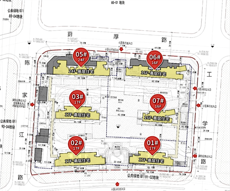 根据设计方案显示,该地块拟建5幢16-17F高层住宅、1幢24F高层住宅以及若干社区配套用房,共计规划约436户。