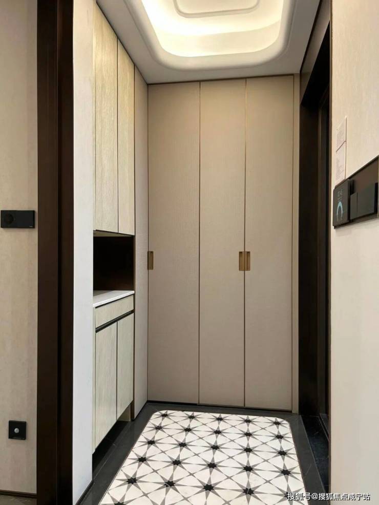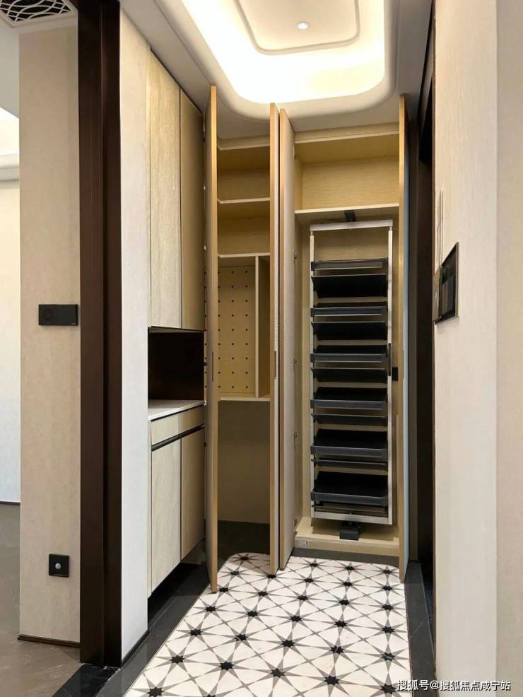 入户玄关采用石材拼花地面,交付玄关柜,柜内配置旋转鞋架、鞋柜精灵等贴心设计;