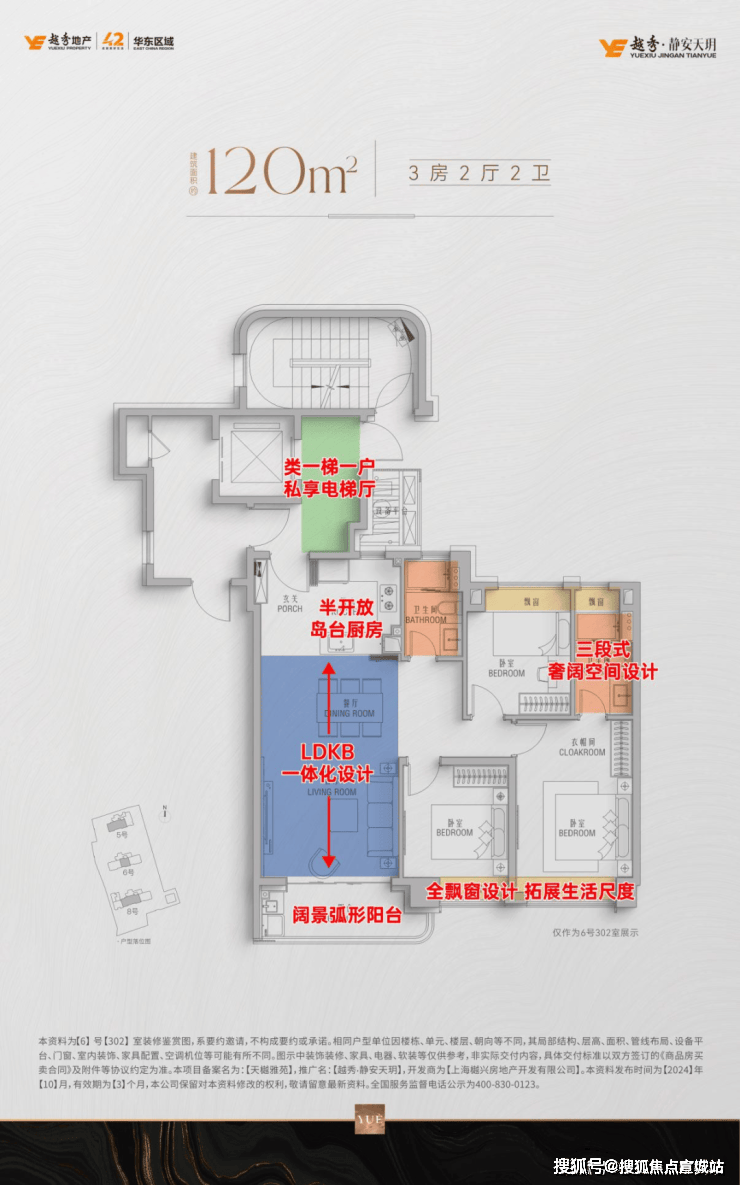 120㎡户型同样沿用142㎡户型的高端配置,类一梯一户,私享电梯厅空间;正三房空间尺度,适应全龄家庭居住需求;约3.8M一体化主厅,以直通进深约1.6米阔景阳台,形成一个纵向舒适的大场域,自由朗轩尺度,肆意享受阳光的温暖和海风拂面的凉爽;峯范套房主卧,配置飘窗拓展空间;约4.5㎡独立卫生间,干湿三分离空间,人性化细节考究,再次让所有人感受到了静安天玥的静奢主义美学。