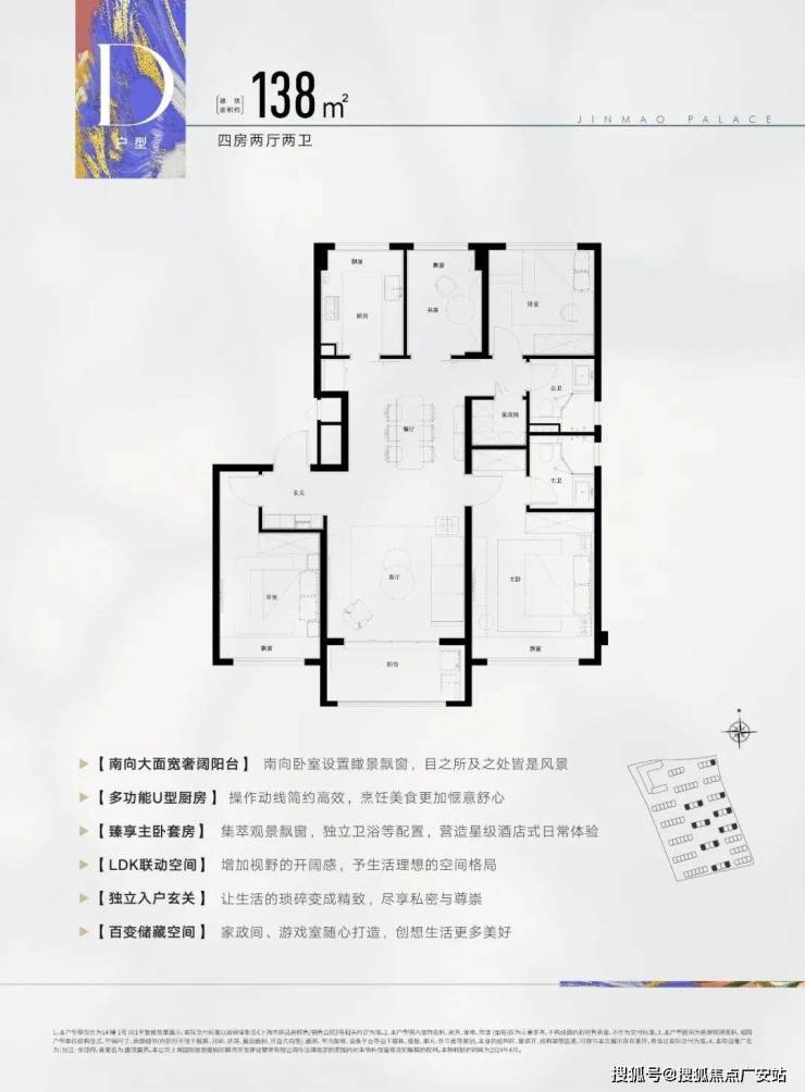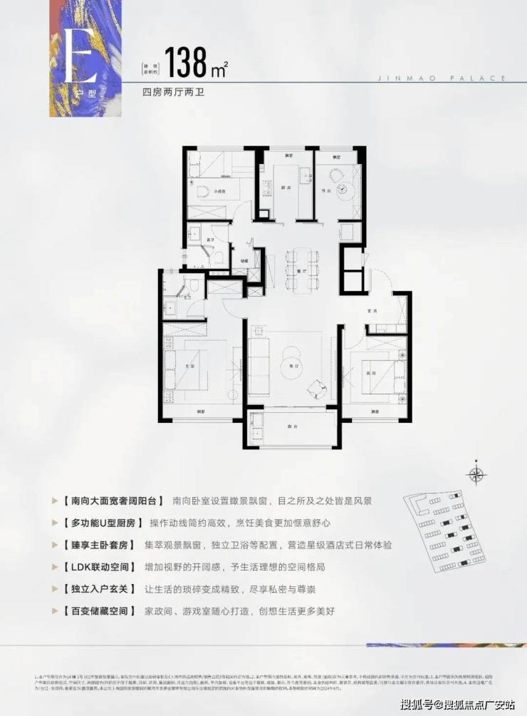 此户型为飞机户型,可以说是改善人群非常喜欢的户型,建面约138㎡4房2厅2卫设计,动静分区,三开间朝南,各空间尺度奢阔,还有一个大面宽景观阳台,实现功能性和舒适度兼得。