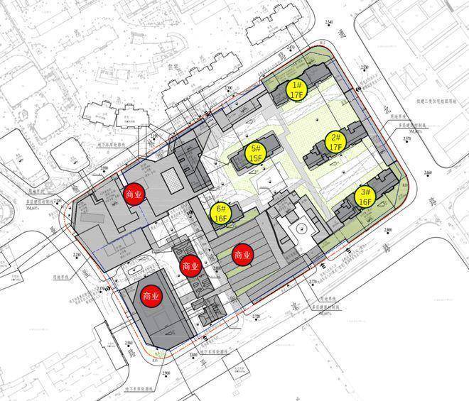 根据设计方案显示,地块拟建5幢15~17F高层住宅及大规模商业建筑。