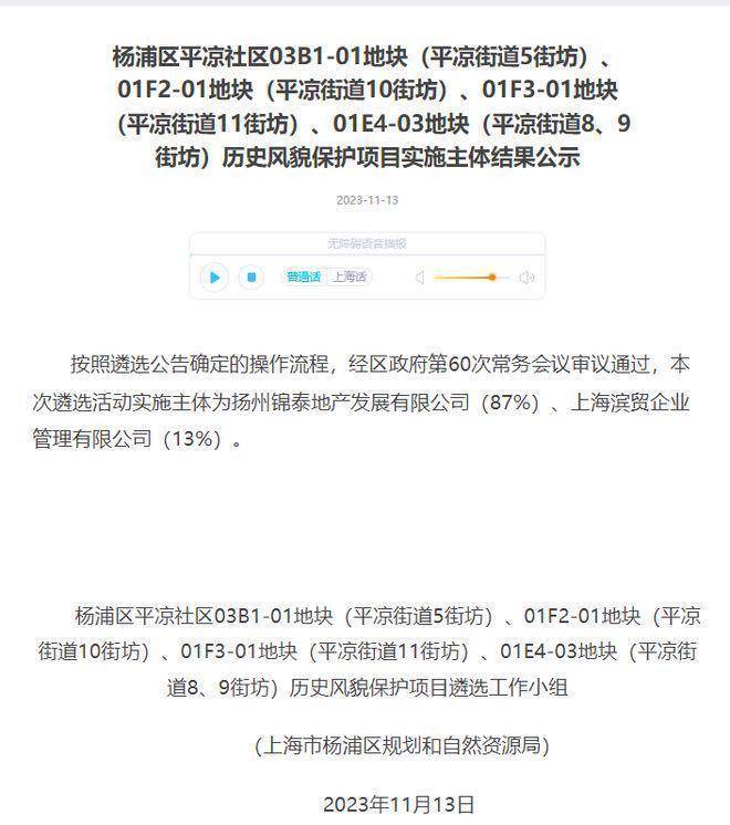 2023年12月,中信泰富(87%)联合杨浦国资(13%)通过协议出让,以总价1143905万元,楼面价63127元/m²竞得4宗打包地块:杨浦区平凉社区03B1-01地块(平凉街道5街坊)、01F2-01地块(平凉街道10街坊)、01F3-01地块(平凉街道11街坊)及01E4-03地块(平凉街道8、9街坊),总建筑面积18.1万㎡。(其中住宅建筑面积11.3万㎡,办公建筑面积5.2万㎡,商业建筑面积1.6万㎡)