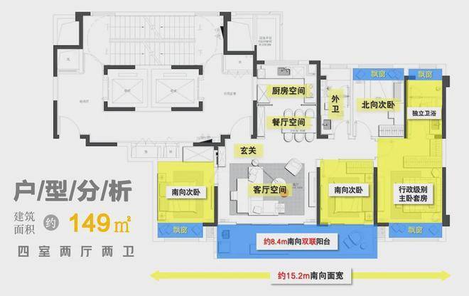 南向面宽约15.2m,空间布局上巧妙融合了经典的大横厅设计;