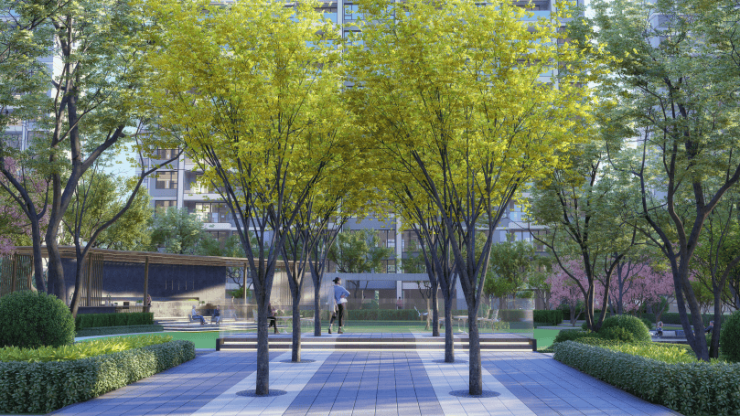 约7000㎡中轴景观,涵盖约3500㎡多功能中央草坪和约200米景观长廊,日常簇拥花间草木,让建筑与绿意和谐生长。