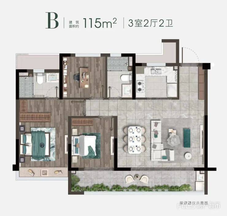 建面约115㎡,更是拥有近12米南向plus采光面,约8.6米双联大阳台连通餐客大横厅和次卧,超广角采光揽景,一抬眼,四季风景宛若悬挂在窗前的高清大片,每一帧都如入画境。