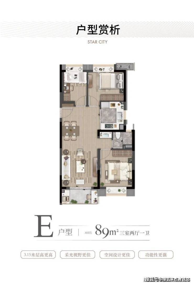 ·约89㎡户型:大虹桥范围不到90㎡的户型大部分都只做到2房,灿耀星城该面积段实现3房功能性,让自住客户一步到位,也让该产品进入二手市场后具备降维打击的优势!