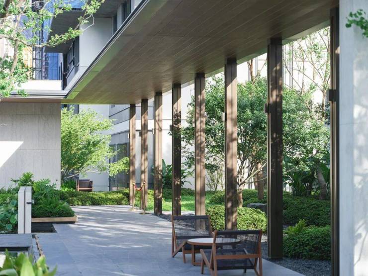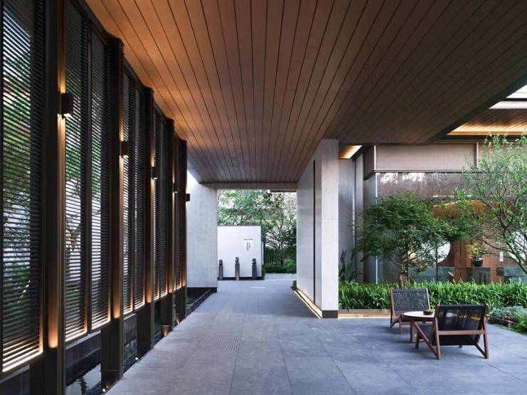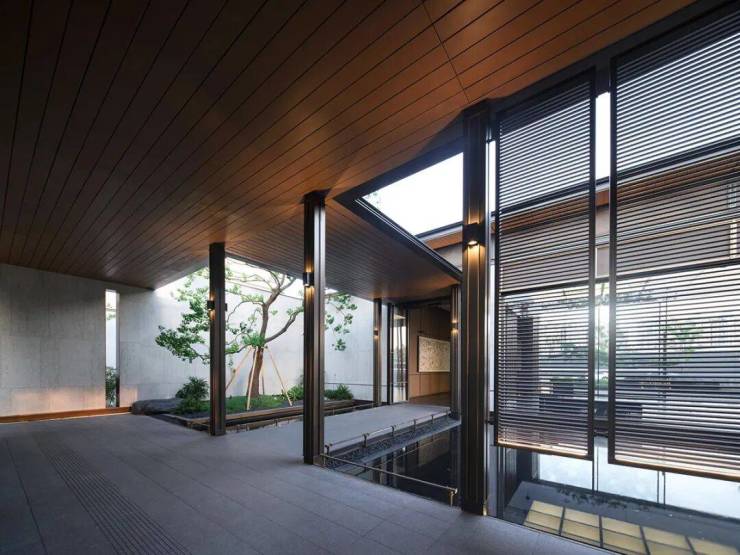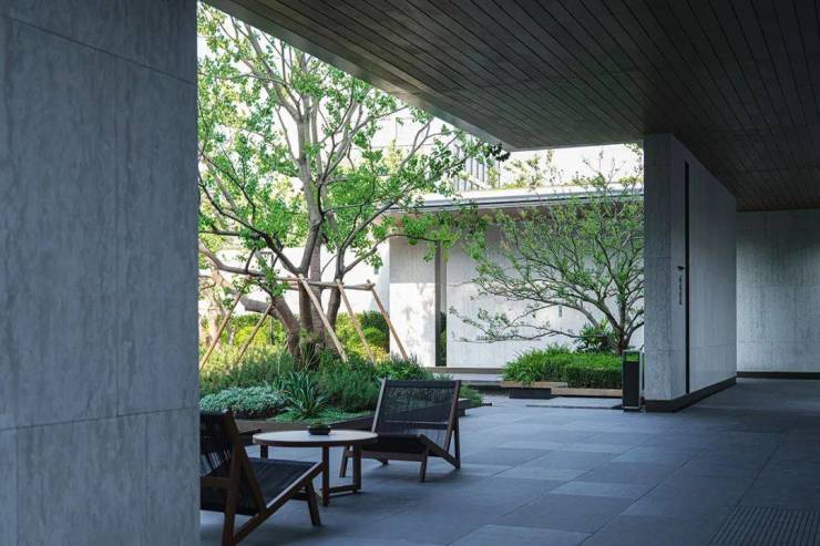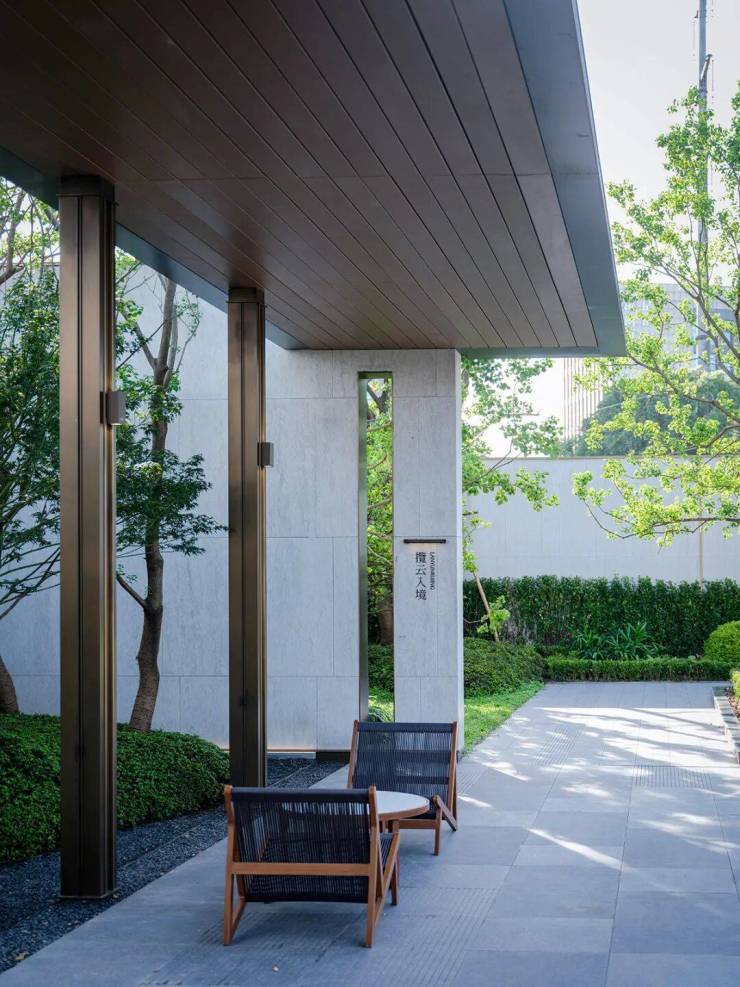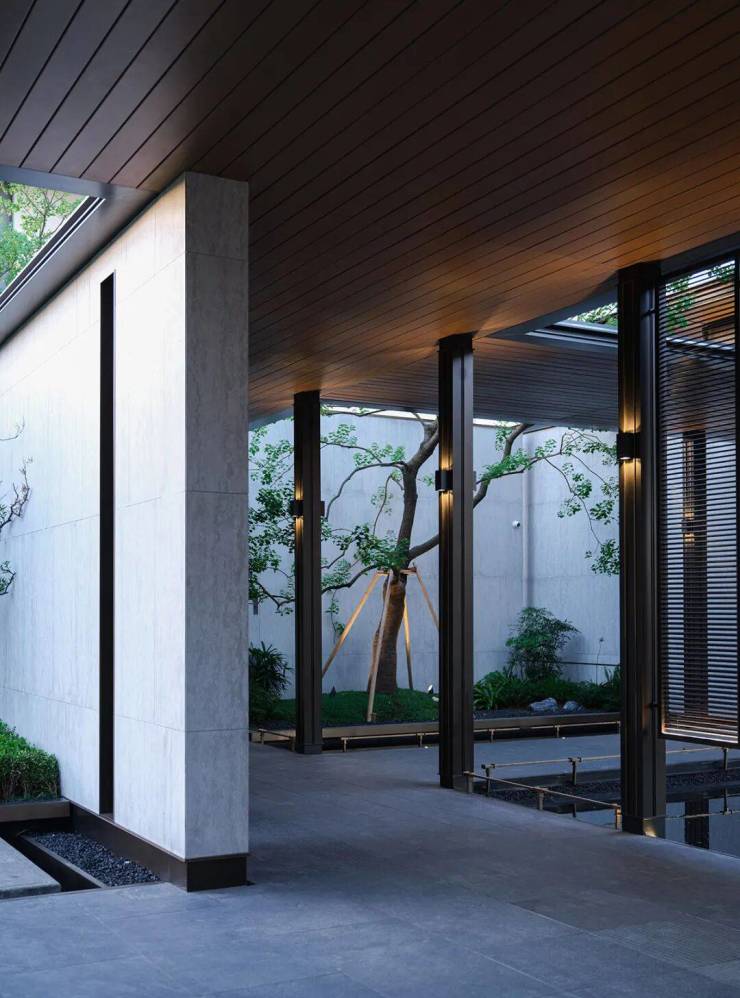 建筑的美感犹如丝绸画卷般展开,展现着泼墨挥毫的水墨印染美学。苍松翠石傲立其中,水景波光闪耀生机活力。步入院墙内,别有一番闲逸的生活场景,光影在其中穿梭交织,营造出一种高雅神秘的艺术氛围,令人心驰神往,流连忘返。
