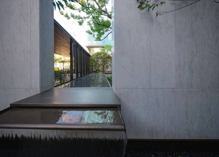 穿过门堂就是长20米宽6米的琉璃光院,设计师以琉璃为灵感,在运用光线、镜面水、简约的植物池和跌水等景观元素的基础上,巧妙地勾勒出一幅绝美的画卷,宛如时空之门,每一处空间均兼具实用与美感,这种一体化的空间设计,源自对生活的憧憬:使建筑场所诗意化、奢意化和场景化。