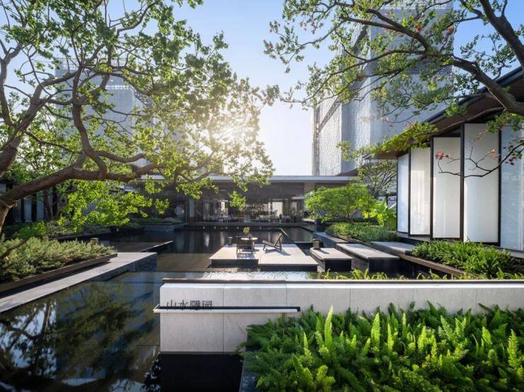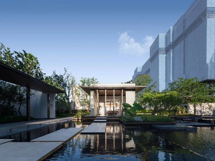 虚的庭院,被实的建筑环抱。园中临水轩堂,环绕于绿树和水景之间,恰似水墨画中的留白,邀请人们驻足其间,感受风的轻抚,聆听鸟的歌唱,体验宁静与恬淡。