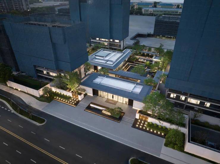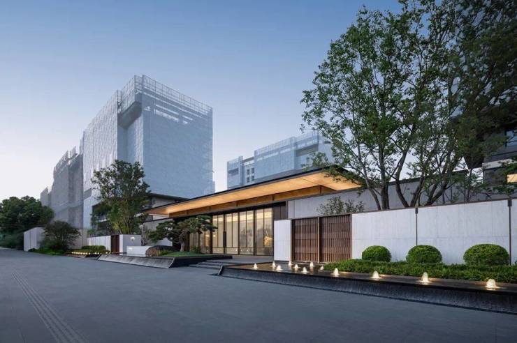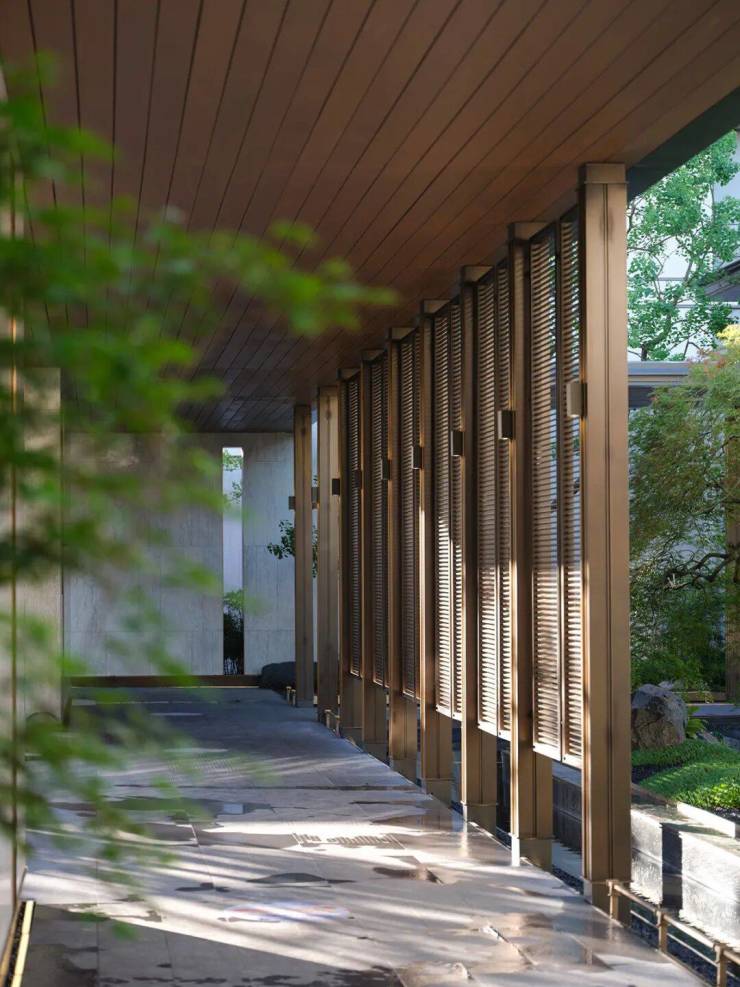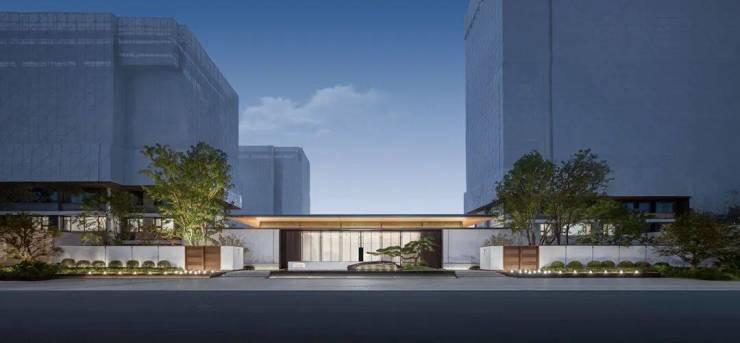 建筑门堂主体高宽比1:5-1:6,建筑与景墙横向延伸,在入口的两侧创造了可视化的归家路径,精致水景与景墙构建出一幅绵延的城市画卷,彰显出江南昆山独有的东方诗意风情,体现了其奢华和精致的材质细节,而这美轮美奂的设计犹如流动的江南水墨,充满细腻和深邃,完美地展示出昆山的典雅和精致之美。