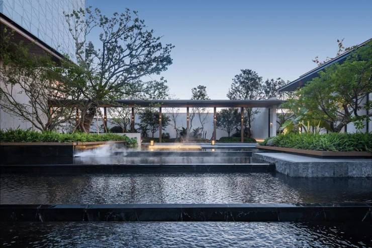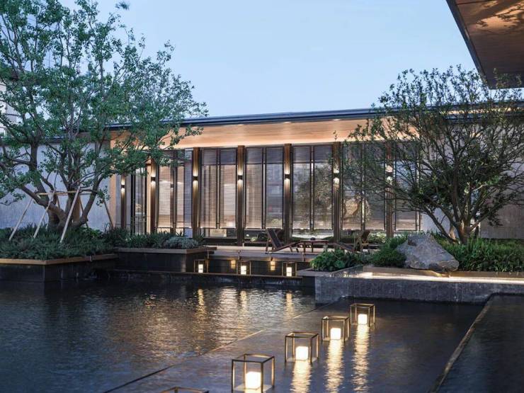 琉璃光院作为第三重归家礼序,光线穿透超薄镜面水面,便迸发出晶莹剔透的琉璃光辉。碧绿的树影映照在水面上,营造出一种清幽空灵的视觉美感,仿佛将归家的业主从喧嚣的外界引向内部宁静的私人领域,完美地体现出现代人对返璞归真的追求,放下那份喧嚣与风尘,让潺潺水声洗涤心底那份疲惫,回归铜墙铁壁外的桃花源。