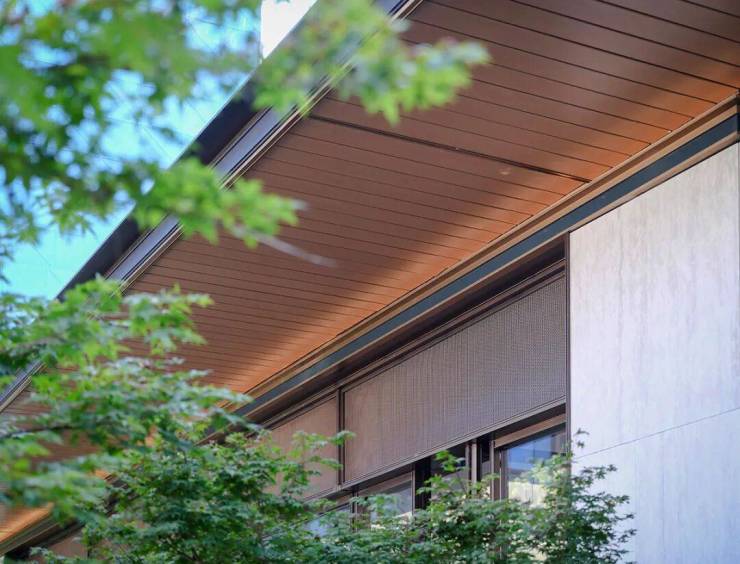 示范区初入眼帘,屋檐灵动轻盈,古铜色屋顶光芒渐进流转。建筑主体采用浅米黄色的维纳灰石材,勾勒出建筑浅色的基调,石材的肌理天然地顺应江南城市独有的水墨质地。
