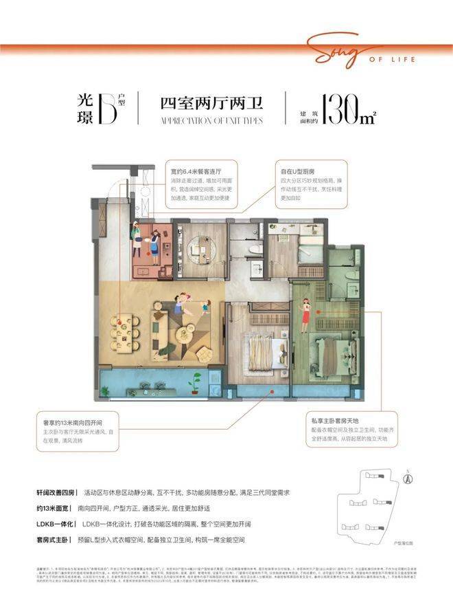 约106㎡户型点评:双联阳台约6.7米面宽,加设L型俯景面,满足晾晒、赏景、采光三重需求,LDKB一体化设计,打破各功能区域的隔离,整个空间更加开阔,开放式厨房 U型厨房,封闭敞开随心切换,高效台面设计,操作动线更加合理!