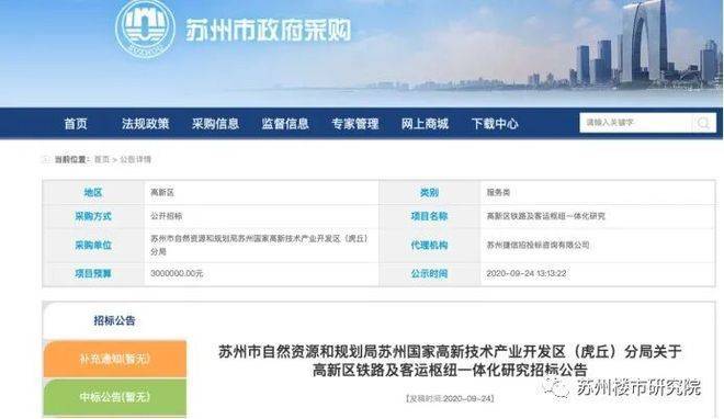 9月24日,苏州市政府采购网发布了《高新区铁路及客运枢纽一体化研究招标公告》,研究招标中,明确提及了科技城站综合枢纽的定位。