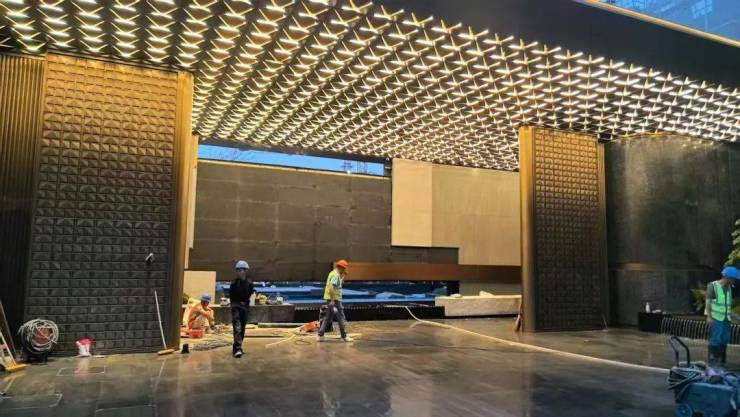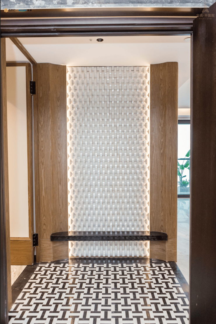 样板间进门后,映入眼帘的是陶瓷的编织纹玄关背景墙,极具质感和尊贵感。