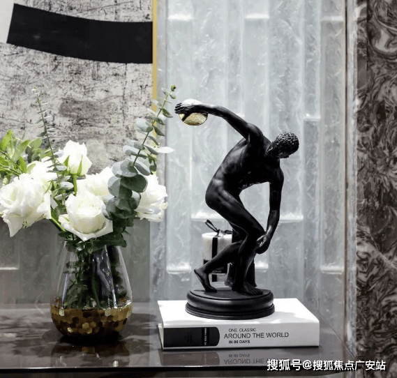 茶几上摆放着黄色金属的工艺品,通过材质的造型和线条,让空间显得更有设计感,同时也凸显出空间主人的精致和时尚。
