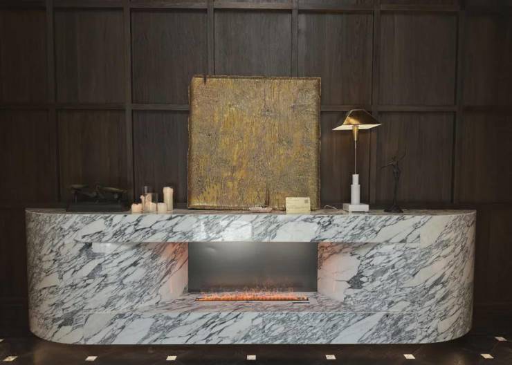 左侧是休息区,摆放着一些精致的雕塑及其他小品摆件,中央壁炉很有意式古典风情,配上白杨木大漆艺术品,古典又华丽,未来业主可以在这儿休憩、等车、接待等。