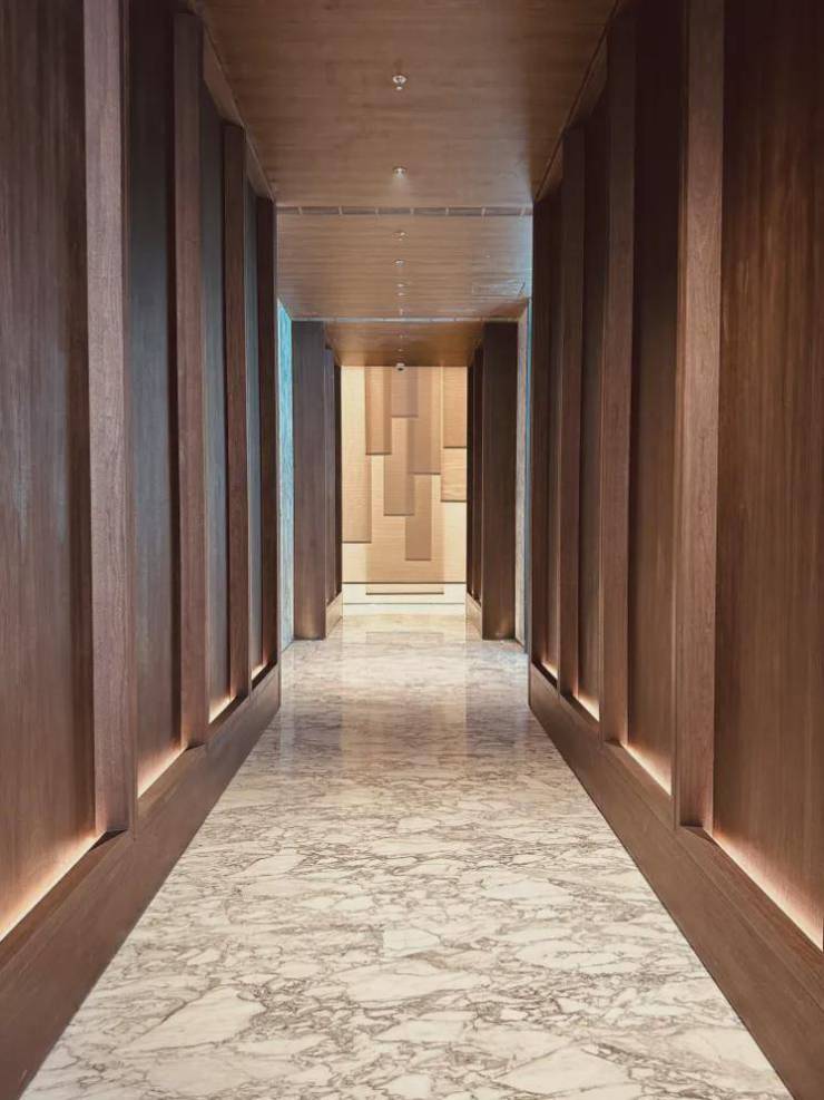 进门右侧,是通往整个下沉式会所的地方,深色胡桃木通铺墙面,质感厚重典雅。整个下沉式会所,以庭院为景观核心,这种环绕式的设计,几乎在任何一个会所的功能空间,都能正对中央景观。