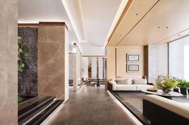 比如,项目打造全石材双归家大堂,归家大堂地面采用了香格里拉黑通铺,墙面是奥特曼米黄,背景墙则采用了莫奈花园大理石。项目的首层大堂与电梯厅采用梵高印象岩板,电梯轿厢选用冷翡翠大理石。