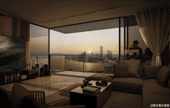 中段用浪白与夕阳金勾勒出270°江景画框;