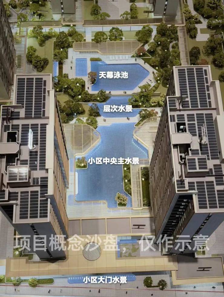 绿城竟然在小区里面造了一个天幕泳池,还有额外的水景(中央主水景+层次水晶)。从小区主入口看过去,水景连接泳池再与淡蓝色天空相连,视觉上的愉悦感充分拿捏。