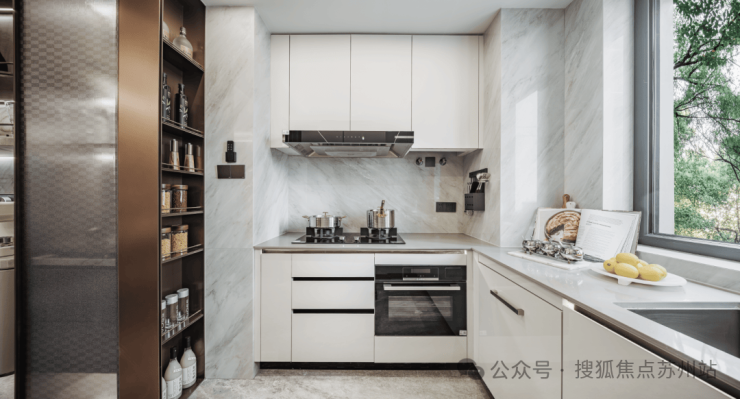 双套房设计的“豪华感”更是实打实的兑现。南向老人房带独立卫浴,解决长辈起夜不便的问题;样板间里, 博世六件套厨电(燃气灶、油烟机、洗碗机、蒸烤一体机、双冰箱)整齐排列在厨房,要知道,这配置连市中心12万+㎡的豪宅都鲜少配齐。