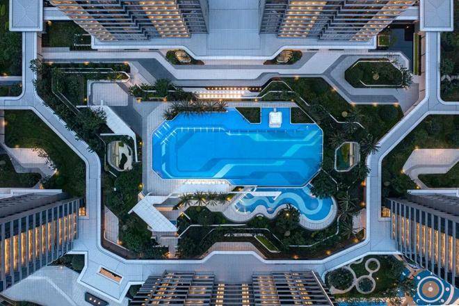 一座梦幻感的度假风特色泳池,如一颗不规则的宝石掩映在信达中心|杭州壹号院的中心园林之间,远远望去,高差与叠水的巧妙让泳池仿佛漂浮于空中,这一方承载着欢笑与成长的空间,增添了生活的无限乐趣。夏天,这抹都市生活里的蔚蓝,打开一种既可观赏又可畅游的生活方式。