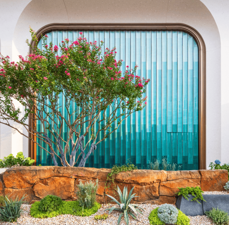 After the welcome area, the first large landscape group in this display is: the Shimmering Pool Courtyard.