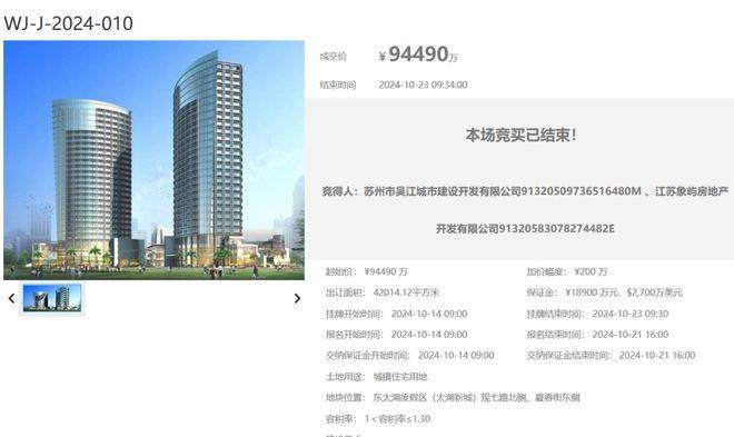 太湖天誉,即吴江城建&象屿10号地块,位于东太湖度假区(太湖新城)规七路北侧、夏蓉街东侧,住宅用地,2024年10月,该地块由吴江城建和象屿联合竞得!地块成交总价94490万元,成交楼面价17300元/平,溢价率0%。