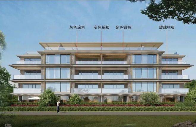洋房外立面则是灰色涂料、灰色铝板、米白色仿石铝板和玻璃栏杆!