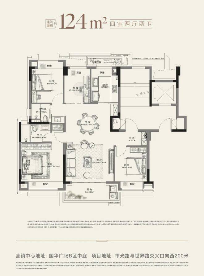 建筑面积约124㎡四房南北通透,是五层低密洋房产品,改善一步到位,很适合三代同堂家庭居住。