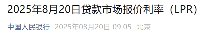 中国人民银行授权全国银行间同业拆借中心公布, 2025年8月20日贷款市场报价利率(LPR)为:1年期LPR为3.0%, 5年期以上LPR为3.5%。以上LPR在下一次发布LPR之前有效。