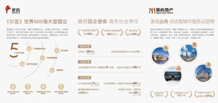 象屿地产集团成立于1993年,是厦门市属国有企业、《财富》世界500强象屿集团的全资子公司。公司聚焦地产开发、商业运营、物业服务、工程代建四大业务领域,以住宅开发为核心,涵盖商业、旧改、长租、养老等丰富业态。秉持“构筑幸福人生“的品牌理念”,致力于打造受人尊敬的综合型城市服务运营商。公司连续多年获评“中国房地产百强企业”、“中国房地产开发稳健经营10强”、“中国华东房地产品牌价值TOP10”。