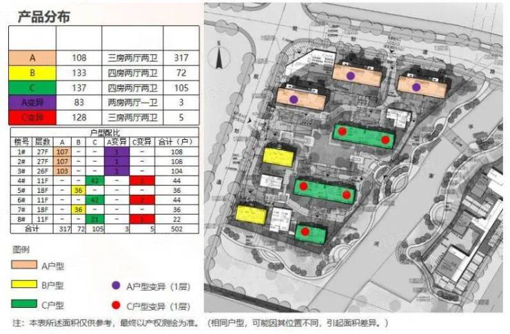 项目总占地面积约2.66万方,建筑面积约7万方,规划建设8栋11-27层的洋房和高层,总户数 502 套,带装修交付,地面绿地率约 30%。整个项目人车分流,车位配比约 1:1.3。