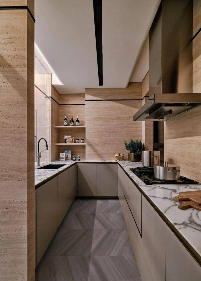 空间中没有冗余的符号,每一个细节都经过精心考量,既满足当代生活需求,又延续了海派文化的精神内核。嘉格纳蒸汽烤箱、真空抽屉组合隐于柜体秩序,与同侧咖啡机呼应。暖木色泽与大理石细腻纹路交织,勾勒出厨间的宁静气韵。