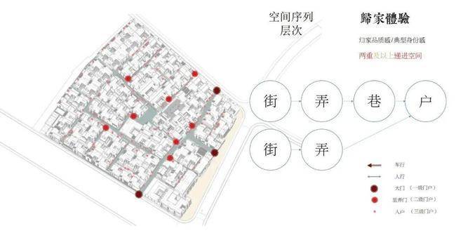 士林润园社区规划可分为蓬莱路城市公共景观以及社区内部景观两个部分,其中市政绿地衔接于上海2035城市总体规划中“蓝绿丝带”的上位条件要求,社区内部街巷空间形成空间序列形成递进的层次,将归家体验的序列依次展开,形成城市街道→入口(一级门户)→街巷→节点空间→里弄门(二级门户)→合院入户(三级门户)的方式,基本可保证大多数住户可体验到两重以上的空间递进。