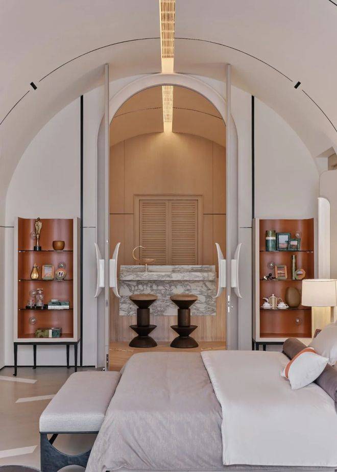 顶层专属于主卧,推开双开门,拱形天花设计尽显浪漫,挑高至3.8米,一条长灯带自浴室贯穿至整个卧房,分置于灯带两侧的弧形结构,环抱出一份安心。而其床头背板也被设计成拥抱的视效,为空间增添温暖包裹的氛围。
