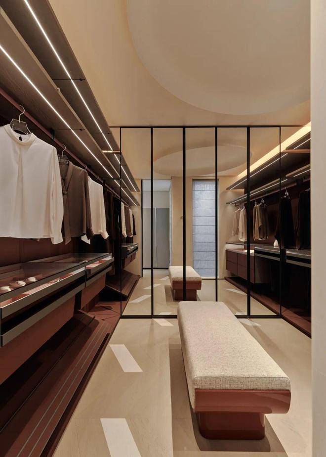 男女主人各自拥有宽敞独立的衣帽间。无论是女主人专属化妆区、贴身衣物放置区,还是沐浴前可方便拿取物品的分置区,都被悉心规划,按照丝滑的生活流程妥帖周到。