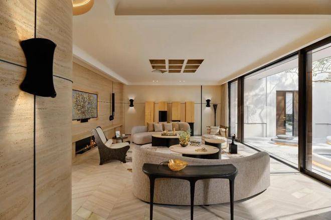这一层更聚焦于私谈、影音、娱乐、品酒、饮茶,深沉又静谧。近6米高的垂直挑空玻璃壁炉矗立于眼前,如同一件令人赞叹不已的大型雕塑装置,它弱化了空间中的大理石承重柱,将其纳入共同构成一个完整的全新的装置,集功能性与艺术性于一身。