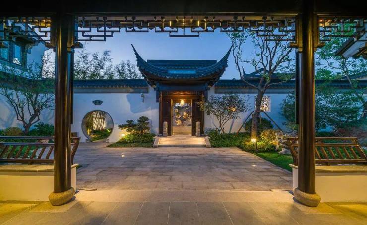 上海桃花源在主入口营造上,以全国同类项目中最强的空间尺度与环抱式入口,辅以三面环廊、四面围筑,呈献东方礼宾庭院。