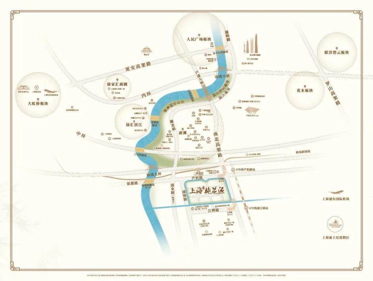 「上海桃花源」位于黄浦江以东的闵行区浦锦街道,是前滩板块旁的首席配套居住区。在济阳路高架开通后,开车快速可达前滩,还可以车行方便速达人民广场、南京西路、百年外滩、陆家嘴国金中心、淮海路IFC、新天地商圈、联洋碧云国际社区、徐家汇恒隆广场,可以说是融合浦西浦东真正精华的地段!