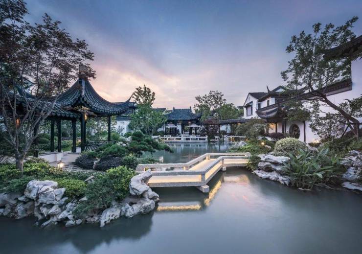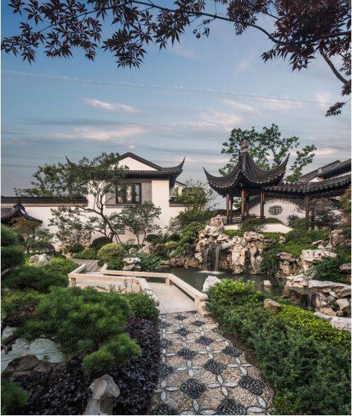 园内设置七处景观组团,以中国各大古典名园为借鉴,并融入宋代的雅致生活韵味。宋式园林更强调“精而造疏,简而意足”,擅以意山水画为蓝本、以画设景,诗词为主题。步履其中,移步换景,步步生趣。花园组团规模扩大,户户有景,各自成趣,或临廊听雨,或观亭赏风,居住更为诗意。